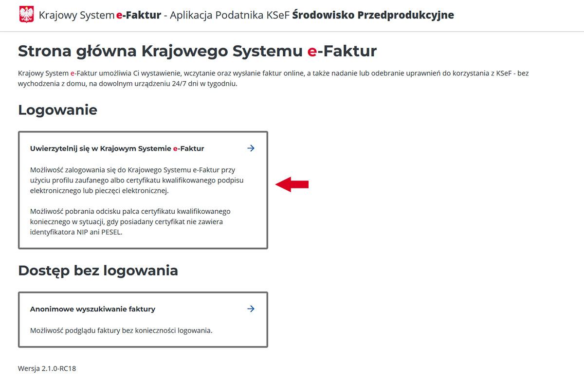 Tutaj należy kliknąć na "Uwierzytelnij się w Krajowym Systemie e-Faktur".