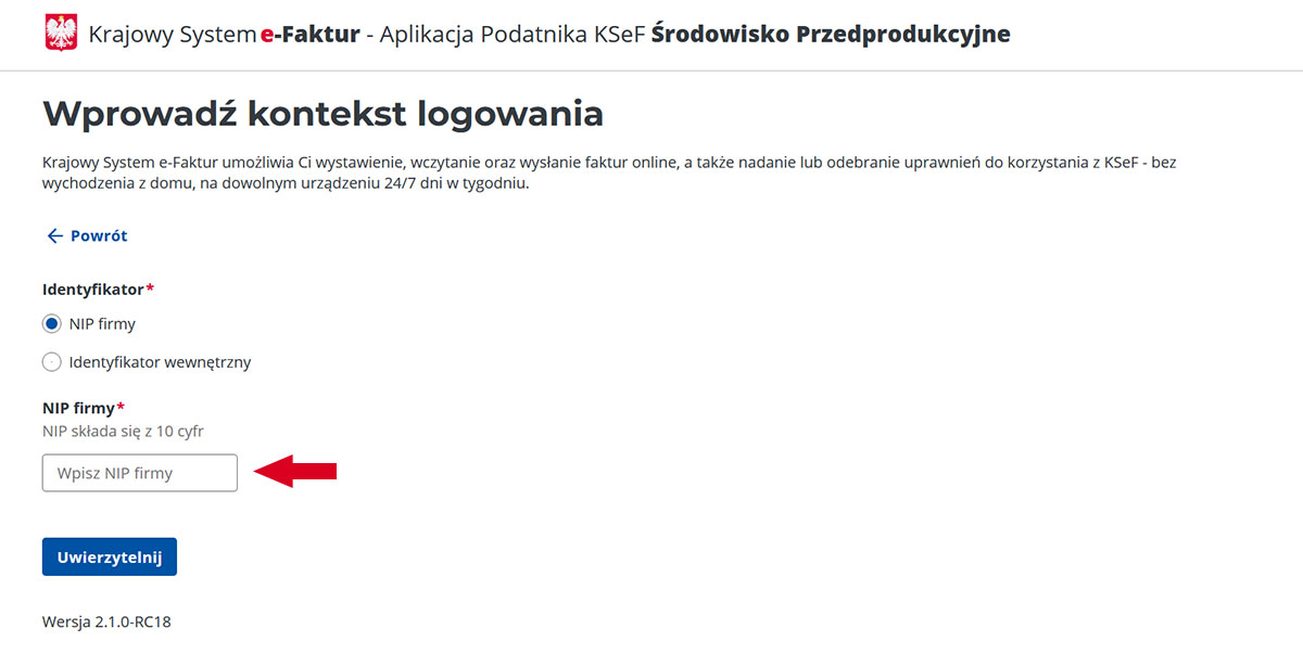 Następnie należy wprowadzić NIP swojej firmy i kliknąć na "Uwierzytelnij".