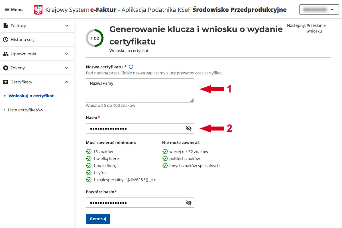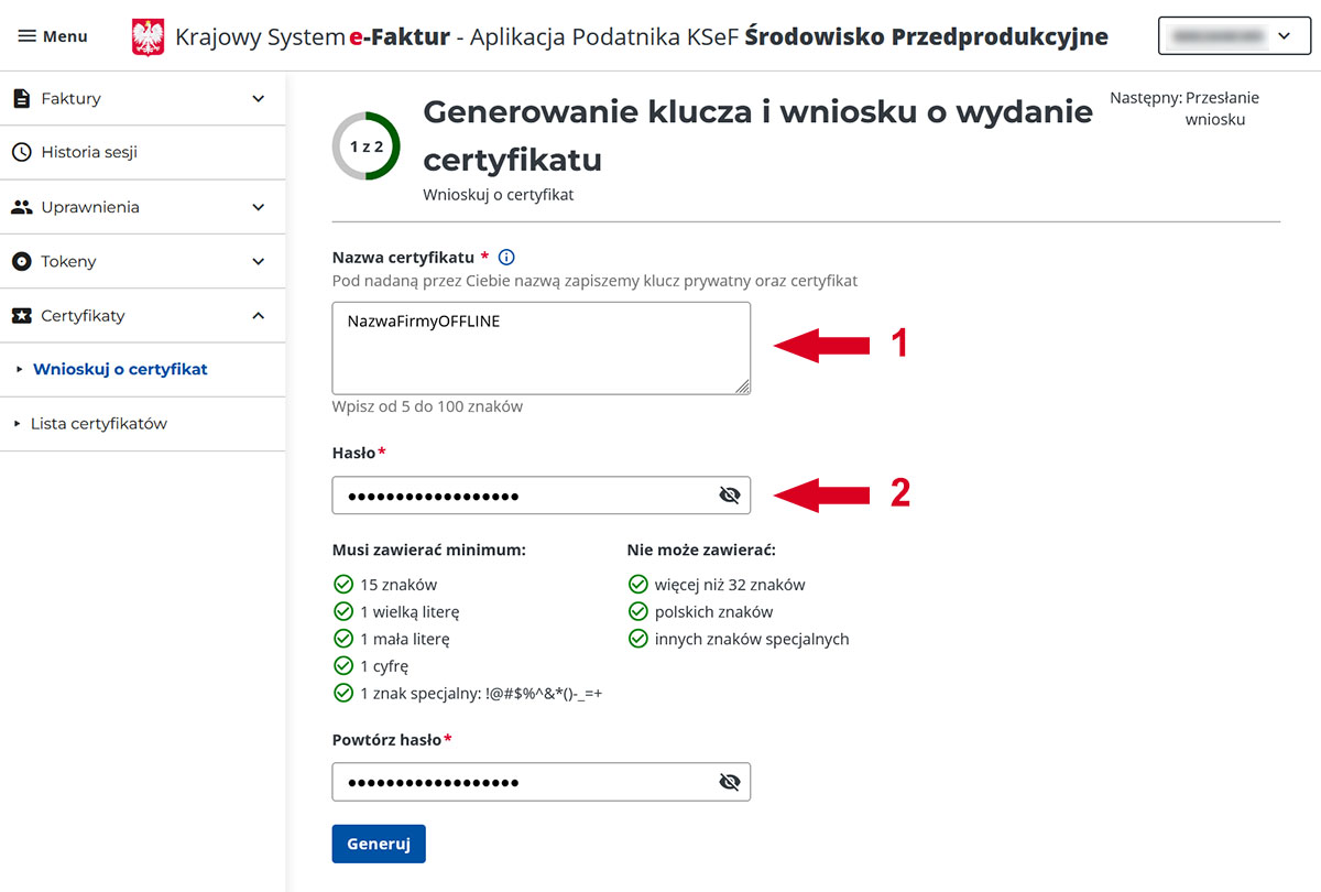 Tutaj wpisujemy nazwę certyfikatu np. "NazwaFirmyDemo" oraz dwa razy hasło zgodne z wymaganiami i "Generuj".