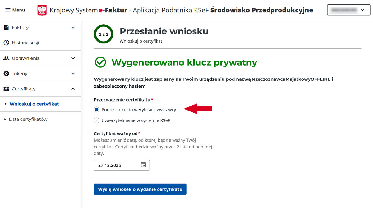 Zaznaczamy "Uwierzytelnienie w systemie KSeF" i klikamy na "Wyślij wniosek o wydanie certyfikatu".
