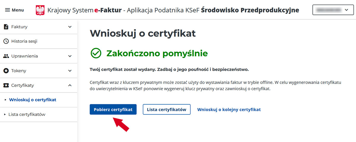 Pokaże się teraz okno w którym klikamy na "Pobierz certyfikat" i zapisujemy go na dysku.