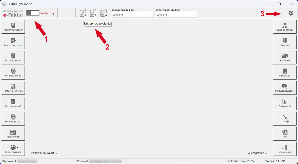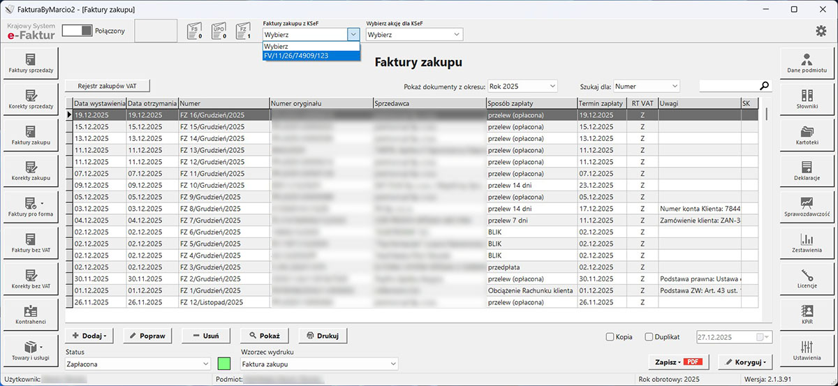 Jak pojawią się nowe faktury zakupu będzie można je zaimportować do programu wybierając pozycję z "Faktury zakupu z KSeF".