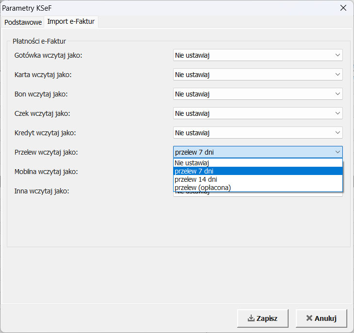 W parametrach w zakładce "Import e-Faktur" możemy przypisać domyślną formę płatności z naszego słownika.