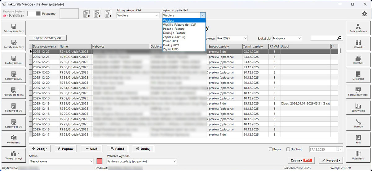 Wszystkie polecenia związane z KSeF można wybrać w "Wybierz akcję dla KSeF".